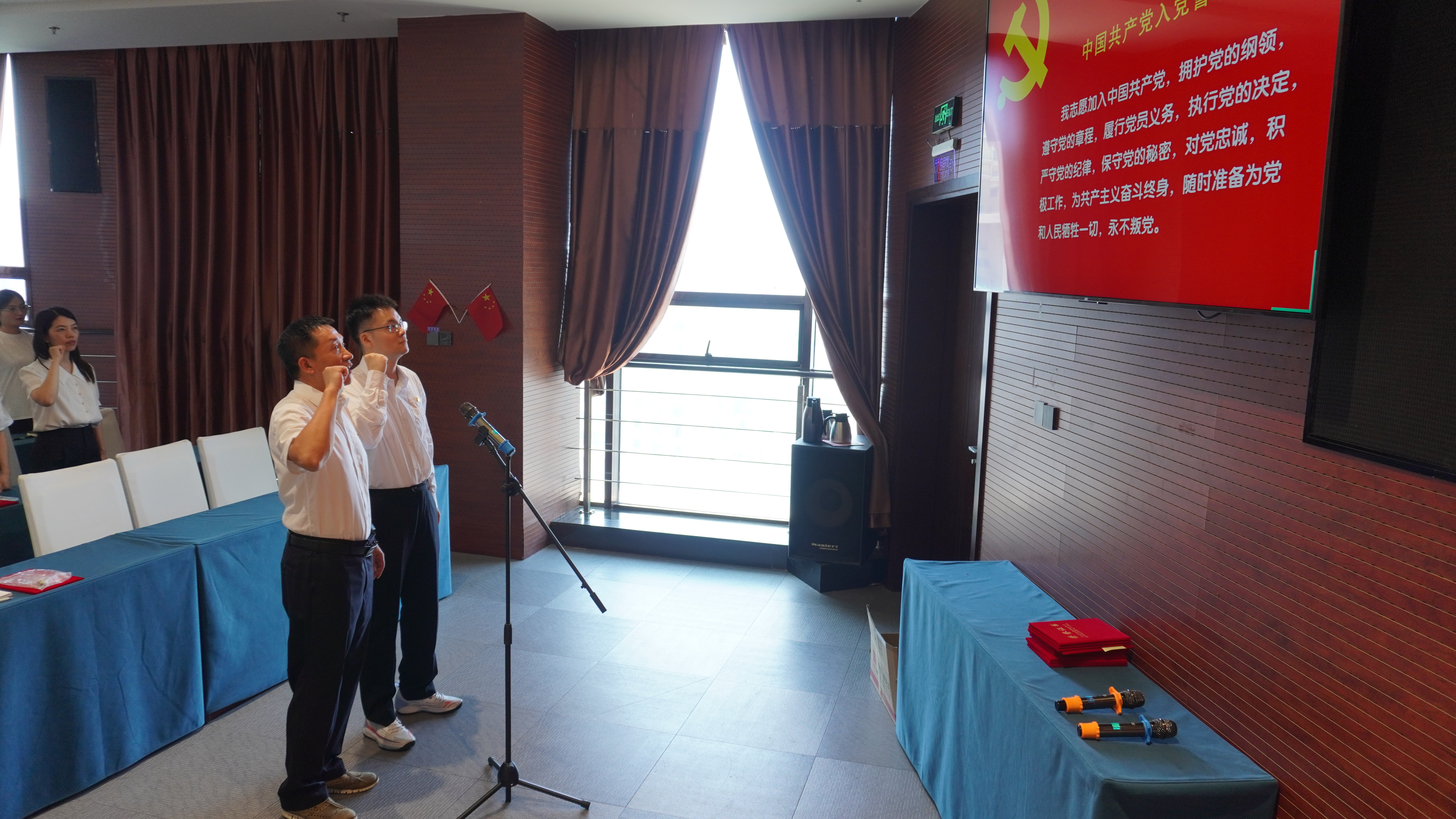 公司黨委委員、紀委書記、工會主席董峰帶領新黨員宣誓、老黨員重溫入黨誓詞。